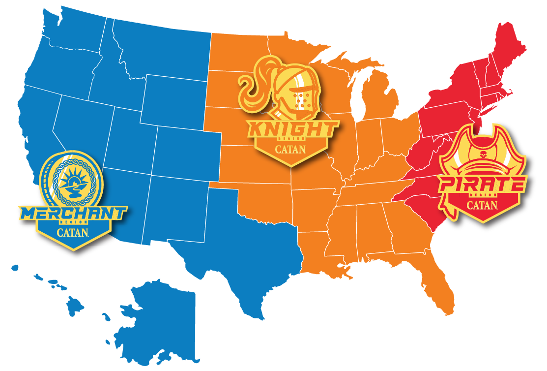 Regional Preliminary events are hosted by a Local Qualifier organizer with support from CATAN Studio. There are three regions: Merchant, Knight, and Pirate. Regions are balanced by annual player participation and event count. Region balance will be reviewed annually.